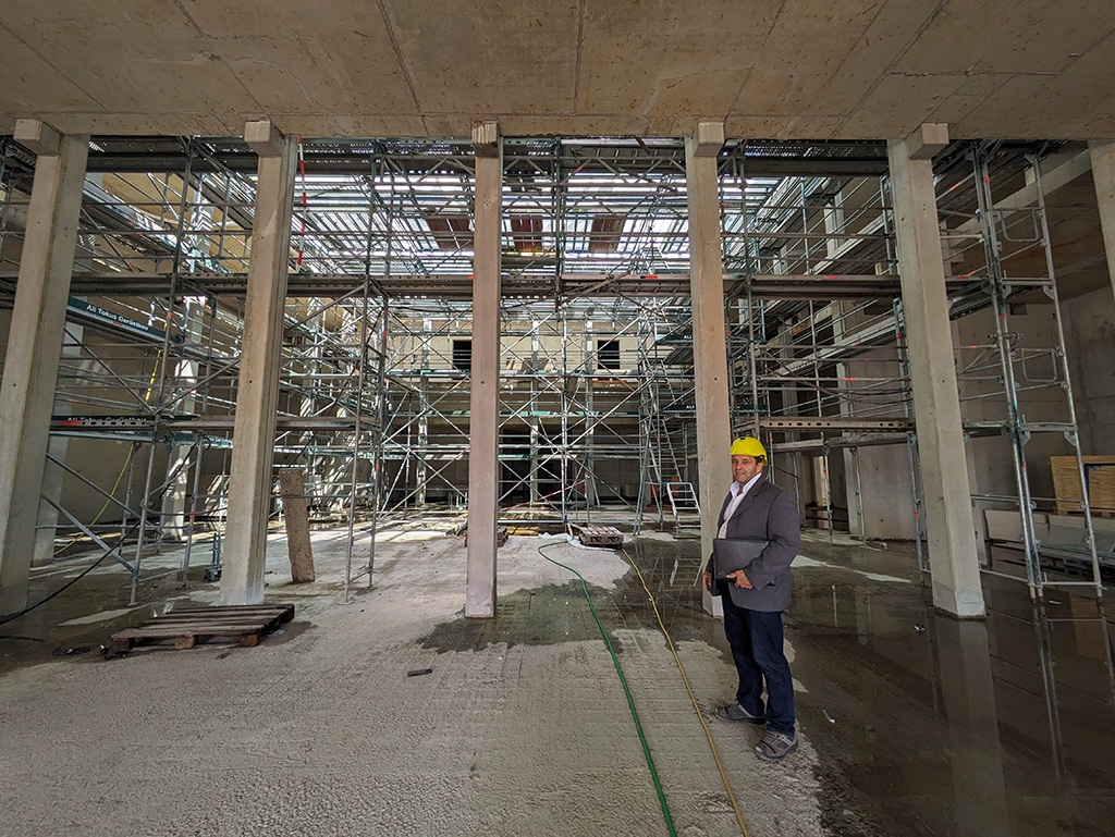 Ein Montag im Frühsommer. Auf der Baustelle an der Stolberger Straße in Köln ist es stiller, als man es auf einer Großbaustelle erwarten würde. Die Rohbauarbeiten an der neuen Zentrale des Verbands der Islamischen Kulturzentren (VIKZ) sind weit fortgeschritten. Nur auf dem Dach sind einige Männer bei der Arbeit – sie montieren die Glaskuppel, die später als zentrales architektonisches Element den Eingangsbereich überspannen wird. Im Inneren des Gebäudes herrscht Baustellenruhe. Keine Maschinen, keine Funken, kein Lärm.